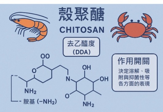 殼聚醣(Chitosan)源自蝦、蟹等甲殼類外殼,是一種兼具天然來源與功能性的多醣素材。在評估其應用價值時,「去乙醯度(Degree of Deacetylation, DDA)」往往是最關鍵的品質指標。