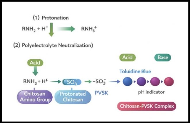♦ 化學反應機理:Chitosan 在酸性下形成–NH₃⁺,與PVSK 的–SO₃⁻發生高分子電中和反應。滴定終點表示原樣品中的胺基已被完全中和。