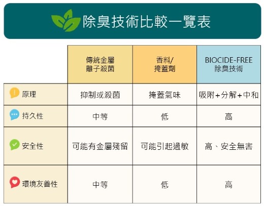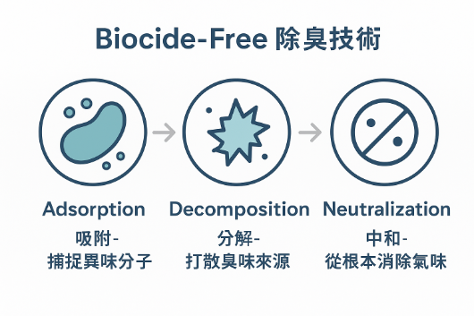 • Biocide-Free 技術:不依賴金屬或殺菌劑,從根本出發,透過「吸附、分解與中和」三重作用,安全高效的科學機制,有效捕捉並消除異味分子,實現真正的「去味」而非「遮味」。