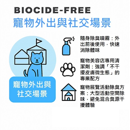在寵物照護領域,BIOCIDE-FREE除臭技術正引領一場價值革新。透過天然可分解配方,有效避免化學殘留,降低毛孩皮膚敏感與呼吸道負擔,實現真正的健康安心。其非殺菌型機制從源頭中和異味,不僅提升除臭效果,更讓寵物自在活動、空間清新無負擔。環境友善特性回應永續趨勢,減少污染殘留,強化品牌社會責任感。