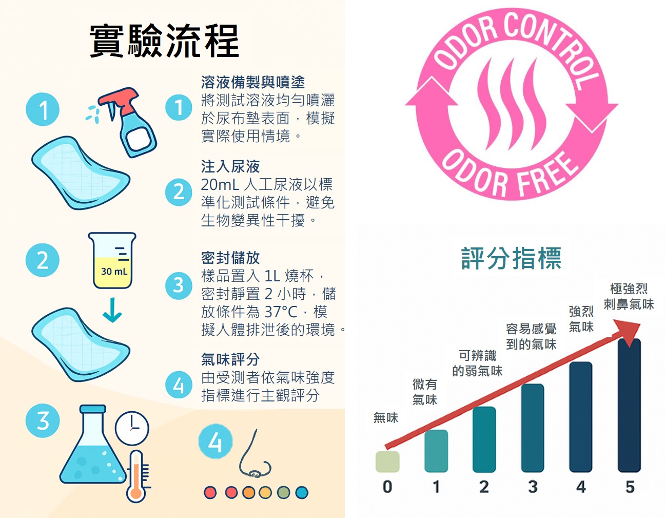 下圖呈現寵物尿布墊的除味測試流程。透過人工尿液模擬實際使用情境,並在體溫條件下密封靜置,完整再現異味產生環境。最後由受測者依氣味強弱打分,從 0(無味)到 5(極強烈刺鼻),準確評估配方的除味效果。